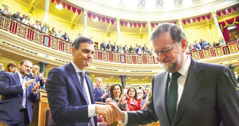 في الوقت ذاته الذي كان فيه رئيس الحكومة الإيطالية الجديد، الذي كُلِّف مرة أخرى بعد أسبوع من فشل المحاولة الأولى، يعلن أسماء أعضاء حكومته من مقر رئاسة الجمهورية في قصر الكويرينالي بروما، كان الستار يُرفَع في البرلمان الإسباني عن المشهد ما قبل الأخير في مأساة سقوط حكومة ماريانو راخوي المحافظة، بعد أن ضمن زعيم الحزب الاشتراكي بيدرو سانشيز الأصوات الكافية لتأييد طلبه سحب الثقة من حكومة الحزب الشعبي الذي تنخره الصراعات الداخلية، وتتآكل شعبيته تحت ضغط فضائح الفساد المالي منذ سنوات.
