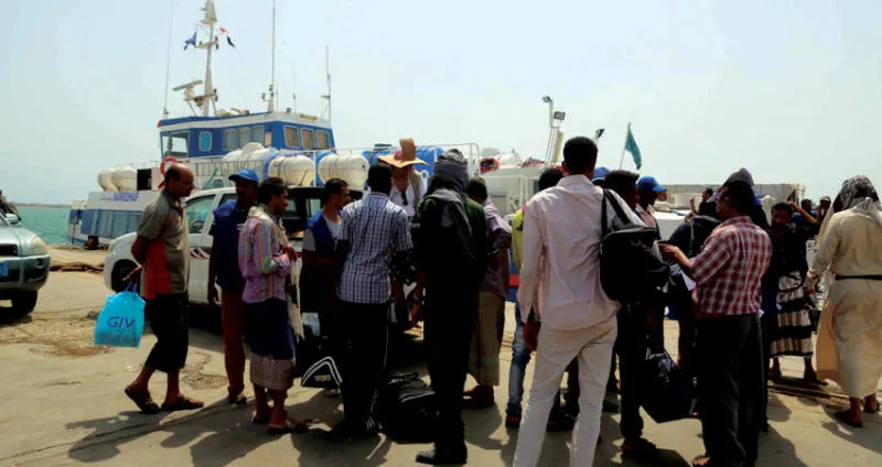 موظفو جمارك يتفحصون أمتعة مهاجرين إثيوبيين قبل أن يستقلوا سفينة في ميناء الحديدة أول من أمس (أ.ف.ب)