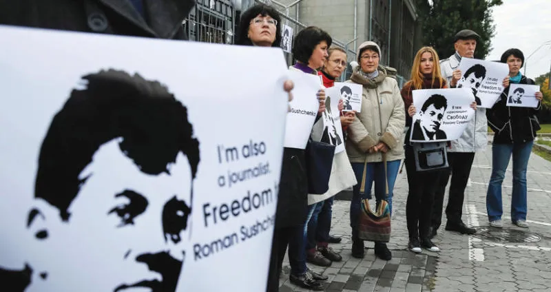 أوكرانيون يحتجون ضد اعتقال روسيا صحافياً أوكرانياً في أكتوبر الماضي بكييف (رويترز)