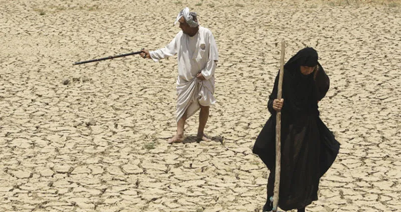 اثنان من سكان الأهوار في جنوب العراق يتجولان في قاع هور بلا ماء جراء الجفاف (أ.ب)