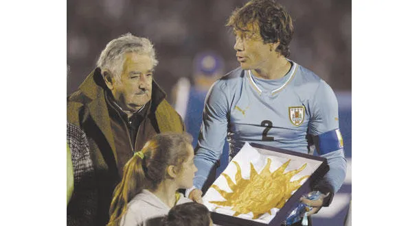رئيس الأوروغواي موخيكا يقدم علم بلاده لجودين قائد المنتخب (أ.ب)