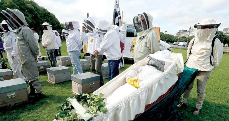 أقام مربون ونشطاء مدافعون عن البيئة جنازة رمزية للنحل في باريس احتجاجا على استخدام المبيدات الحشرية التي يقولون إنها تقتل هذه الحشرات الضرورية للنظام البيئي.