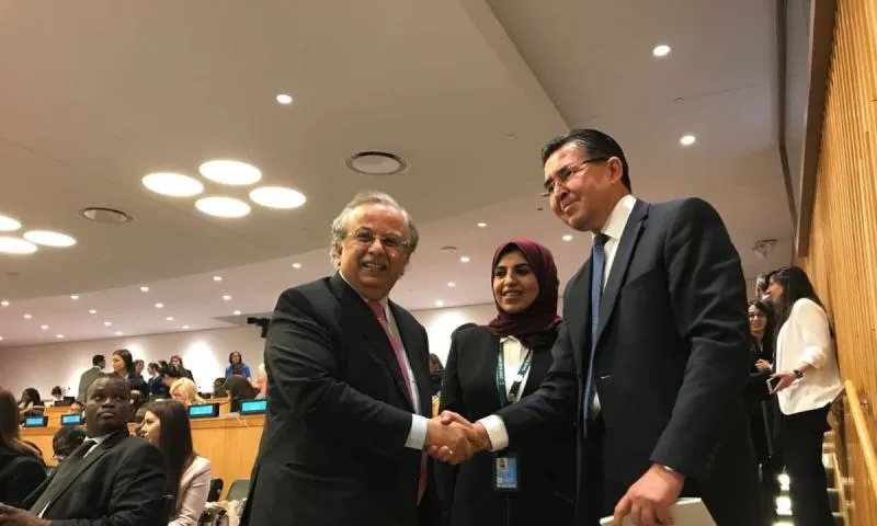الدكتورة تماضر الرماح مع مندوب السعودية الدائم لدى الأمم المتحدة عبد الله المعلمي بعد انتخابها أمس في مقر الأمم المتحدة («الشرق الأوسط»)