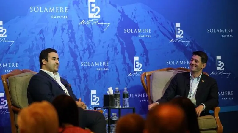 الأمير خالد بن سلمان بن عبد العزيز سفير الرياض في واشنطن خلال مؤتمر المتفائلين والخبراء بالولايات المتحدة وبجانبه رئيس مجلس النواب الأميركي بول رايان (حساب المؤتمر الرسمي على «تويتر»)