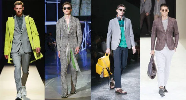 * الأسلوب الـ«سبور» الذي يظهر فيه الرجل منطلقا ومتصالحا مع نفسه من دون أن يتنازل عن أناقته.. فقد كانت هناك بنطلونات واسعة وجاكيتات بسحابات وأحذية مريحة مستوحاة من الأحذية الرياضية.. بما في ذلك الصنادل المفتوحة.. وهي قطع تناسب المدن والمناسبات العادية ولا تتوجه إلى المغامرات أو القيام بأي نشاطات بدنية
