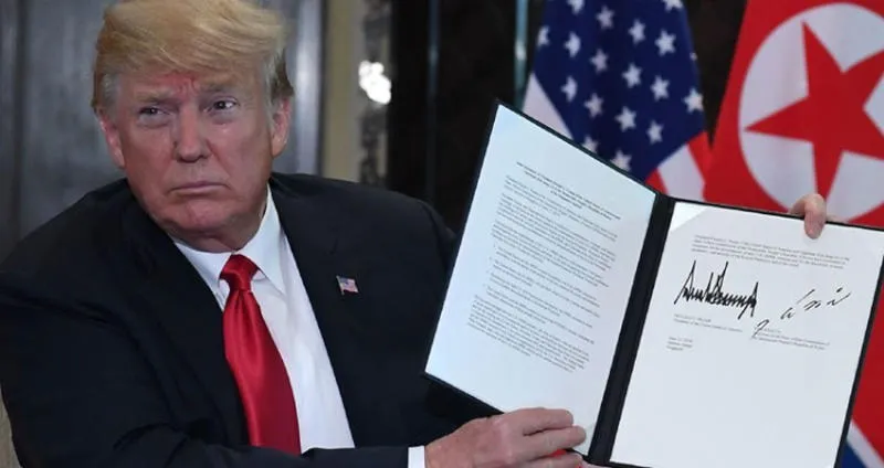 يتعهد الرئيس دونالد ترمب والرئيس كيم جونغ أون التعاون من أجل تطوير علاقات جديدة بين الولايات المتحدة وجمهورية كوريا الشعبية الديمقراطية، وتعزيز السلام والازدهار والأمن في شبه الجزيرة الكورية والعالم».
