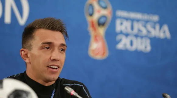 فيرناندو موسليرا حارس مرمى الأوروغواي خلال مؤتمر صحافي في روستوف قبل لقاء المنتخب السعودي (إ.ب.أ)
