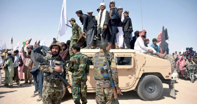 عناصر من «طالبان» على سيارة «همفي» إلى جانب جنود أفغان خلال الاحتفالات بثالث أيام عيد الفطر في مديرية مياوند بولاية قندهار جنوب البلاد (أ.ف.ب)