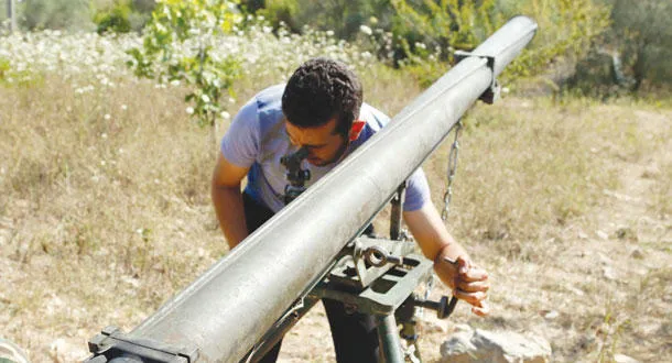 مقاتل من المعارضة السورية يوجه صاروخا لإطلاقه نحو القوات النظامية في ريف اللاذقية أمس (رويترز)