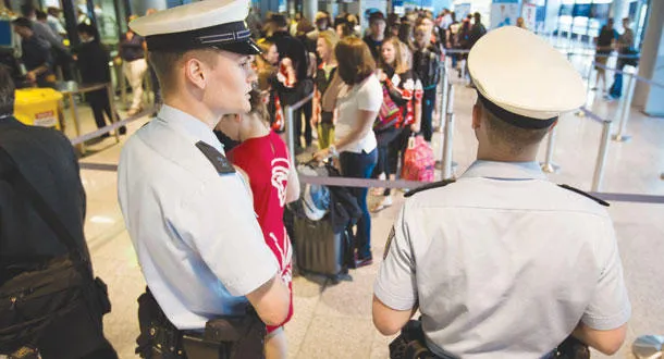 ضابطا شرطة يراقبان الوضع أمام نقاط التفتيش في مطار فرانكفورت الدولي بألمانيا أمس. وطلبت واشنطن أمس تشديد اليقظة في المطارات التي تنطلق منها رحلات إلى الولايات المتحدة في منطقتي الشرق الأوسط وأوروبا بسبب «تهديدات جديدة» إرهابية (إ.ب.أ)