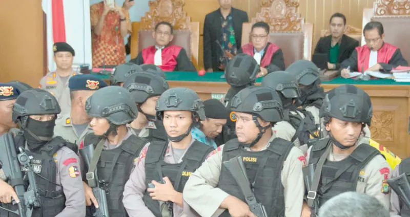 رجال مكافحة الشغب داخل المحكمة في جاكرتا خلال مثول المتهم أمامها (أ.ف.ب)