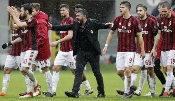 جينارو غاتوزو مدرب ميلان مع لاعبيه بعد فوزه في دوري الدرجة الأولى الإيطالي لكرة القدم على كييفو فيرونا في ملعب سان سيرو بميلانو (آ.ب)
