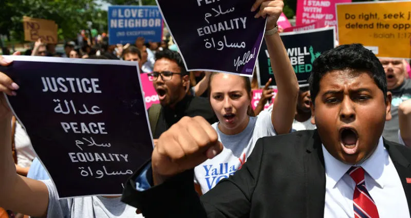 مظاهرة احتجاجية ضد قرار المحكمة العليا الأميركية بحظر دخول مواطني 6 دول في واشنطن أمس (أ.ف.ب)