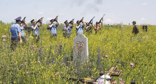 رجال شرطة أوكرانيون يطلقون النار في الهواء خلال جنازة ثلاثة من رفاقهم قتلهم مسلحون مجهولون في دونيتسك بشرق البلاد أمس (ا.ب.ا)