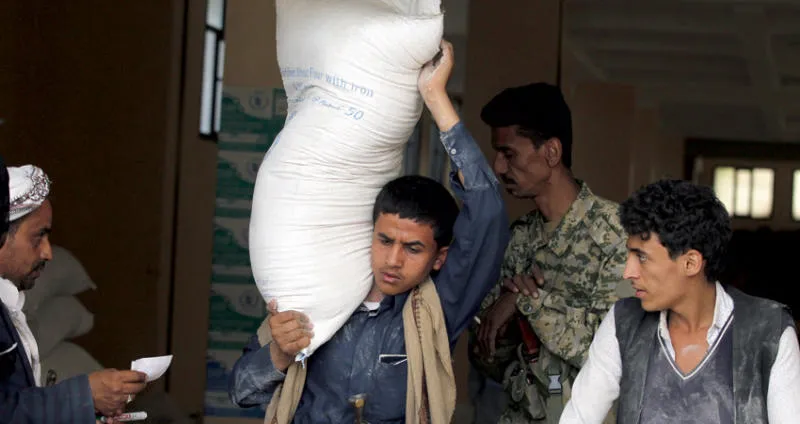 يمنيون لدى تلقيهم مساعدات إغاثية في صنعاء (إ.ب.أ)