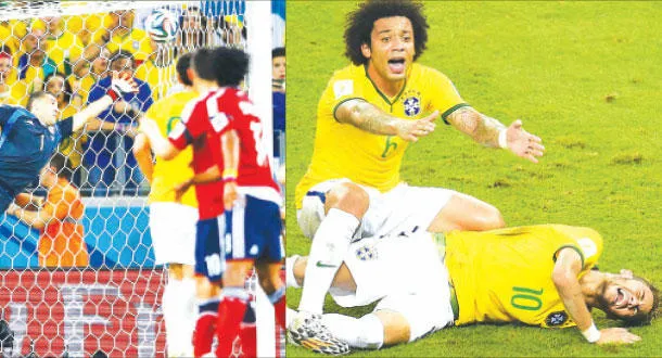 نيمار يتألم ومارسيلو يستعجل الأطباء (أ.ف.ب) و تسديدة لويز رقم «4» تسكن شباك كولومبيا (رويترز)