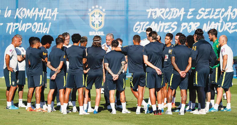 لاعبو البرازيل يلتفون حول المدرب تيتي لسماع التعليمات قبل مواجهة المكسيك (إ.ب.أ)