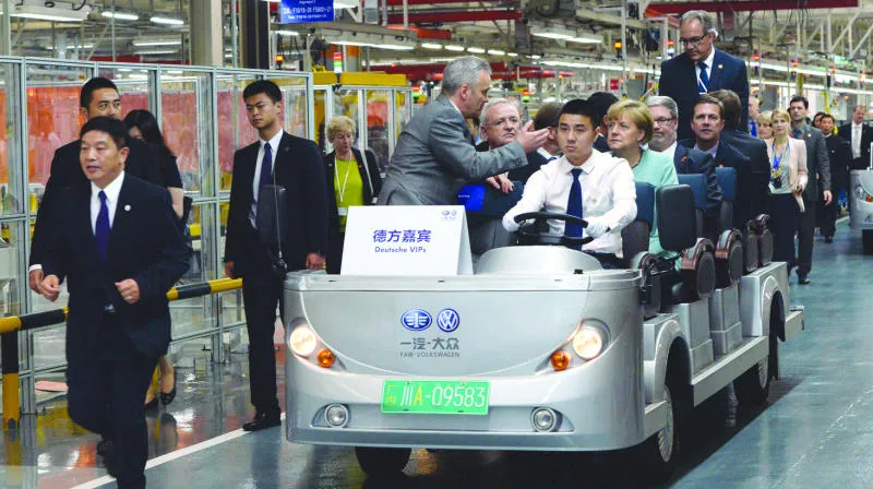 المستشارة الألمانية أنجيلا ميركل إلى جانب مسؤولين صينيين وألمان على متن عربة كهربائية في مصنع سيارات للمجموعة الألمانية فولكس فاغن بالشراكة مع شركة فاو الصينية (أ.ف.ب)