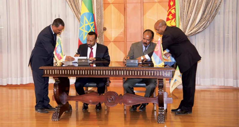 انتهت رسميا حالة الحرب بين إثيوبيا وإريتريا، حسبما جاء في بيان مشترك وقع أمس، غداة لقاء تاريخي بين رئيس الحكومة الإثيوبي آبي أحمد والرئيس الإريتري أسياس أفورقي في أسمرة أنهى 20 عاماً من القطيعة.