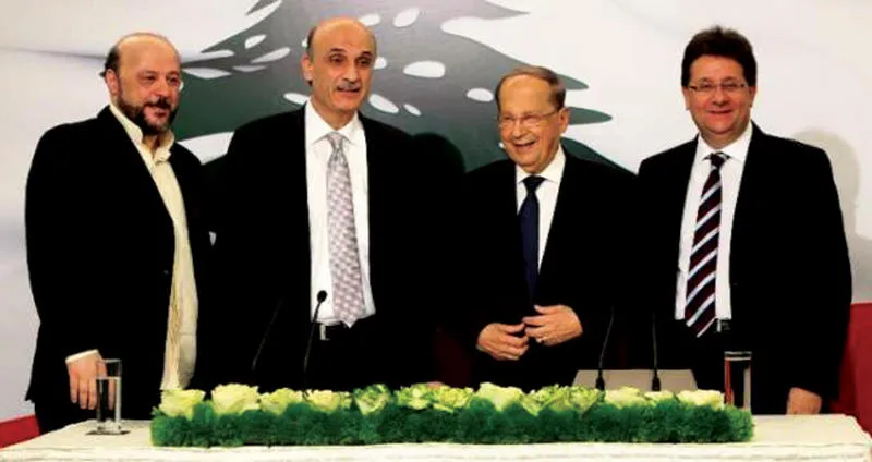 عون وجعجع خلال توقيعهما اتفاق معراب بحضور النائب إبراهيم كنعان والوزير ملحم رياشي (موقع {القوات اللبنانية})