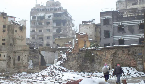 سوريان يمران وسط الأنقاض التي غطتها الثلوج في مدينة حمص المحاصرة أمس (رويترز)