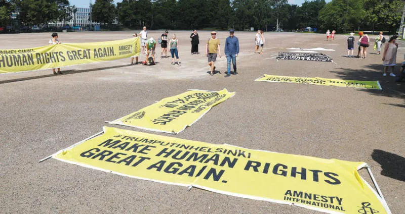 «منظمة العفو الدولية» نشرت إعلانات تدعو إلى «جعل حقوق الإنسان عظيمة من جديد» في العاصمة هلسنكي أمس (رويترز)