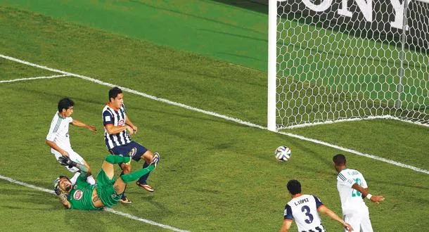 شطيبي لاعب الرجاء بقميصه الأبيض (يسار) يسجل في مرمى مونتيري