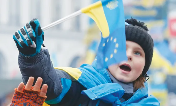 متظاهر أوكراني من مؤيدي الانضمام إلى أوروبا يحمل طفله فوق كتفيه الذي أمسك بيده علم بلاده في ميدان الاستقلال وسط العاصمة كييف أمس (رويترز)