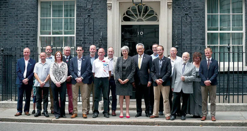 ماي لدى استقبالها في لندن أول من أمس الغواصين البريطانيين الذين ساهموا في إنقاذ «فتية الكهف» التايلانديين (رويترز)