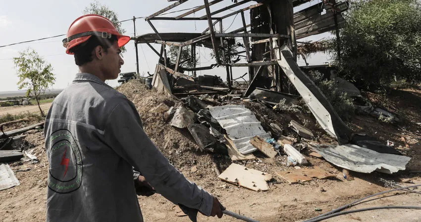 عامل كهرباء فلسطيني يتفقد الأضرار بعد قصف إسرائيلي على غزة (أ.ف.ب)