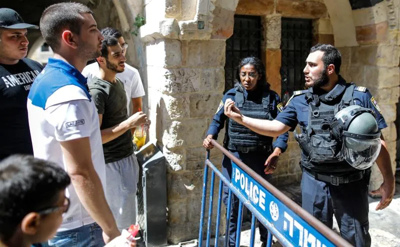 أفراد من الشرطة الإسرائيلية يغلقون شارعا بمدينة القدس القديمة بعد مواجهات بالمسجد الأقصى (أ.ف.ب)