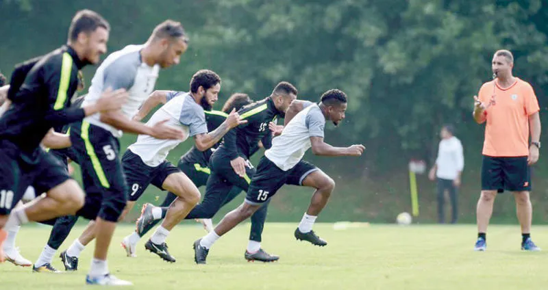 لاعبو الشباب خلال المران في معسكر الفريق بمدينة ماريبور السلوفينية («الشرق الأوسط»)