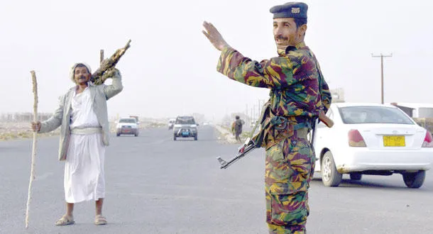 جندي يمني عند نقطة تفتيش على الطريق بين صنعاء وعمران أمس (أ.ف.ب)