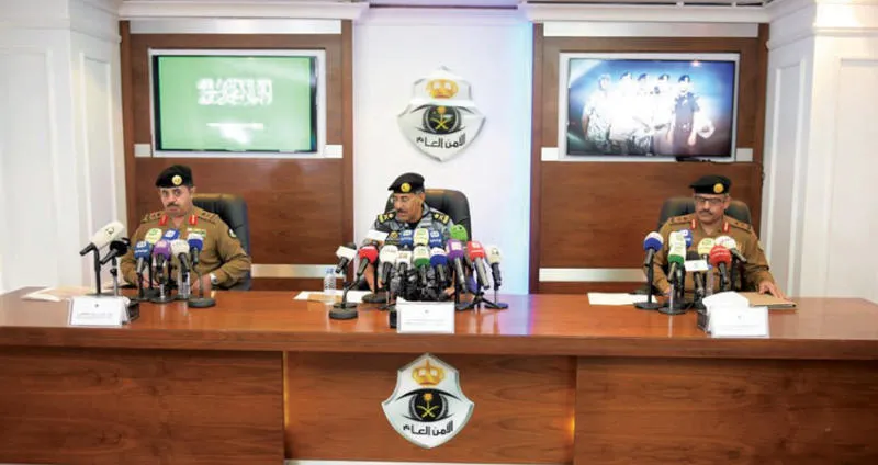 قادة قوات أمن الحج خلال المؤتمر الصحافي في مشعر منى أمس («الشرق الأوسط»)