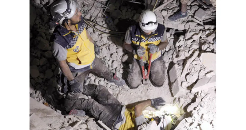 عمّال إنقاذ من جماعة «الخوذ البيضاء» يبحثون عن ضحايا أو ناجين بين الأنقاض في بلدة تعرضت لقصف قوات النظام غرب حلب ليلة الجمعة (أ.ف.ب)