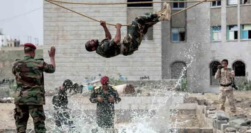 جانب من استعراض مهارات في حفل تخرج عسكري لقوات تابعة للحكومة اليمنية الشرعية في تعز أمس (أ.ف.ب)