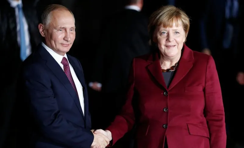 الرئيس الروسي فلاديمير بوتين يصافح المستشارة الألمانية أنجيلا ميركل - أرشيفية (أ.ف.ب)