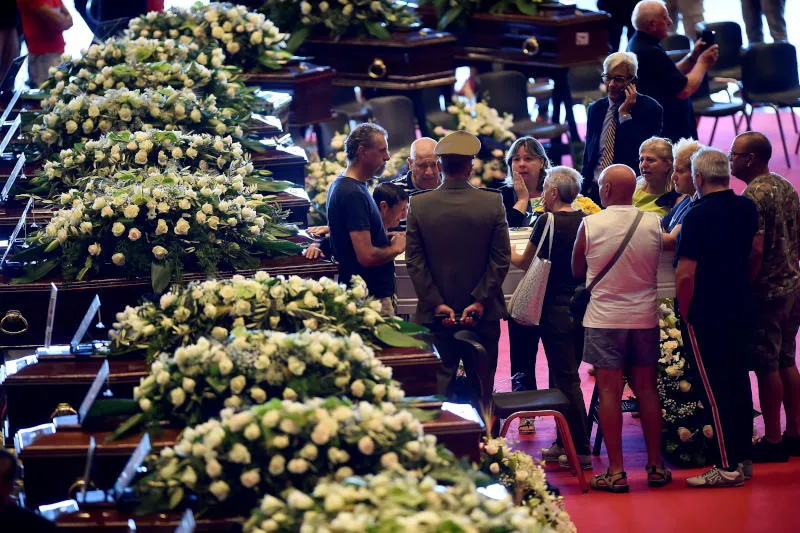 وفي قاعة كبيرة في جنوة، وتمهيداً للقداس على أرواح الضحايا، اصطفت توابيت 18 شخصاً، أحدها باللون الأبيض لطفل. وقد غطيت بالورود وتحمل صور أو أسماء القتلى.