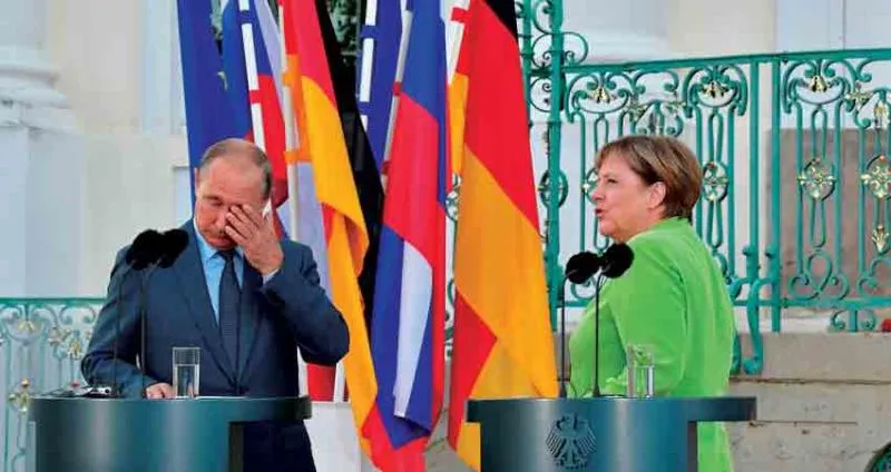 المستشارة الألمانية ميركل والرئيس الروسي بوتين خلال اجتماعهما قرب برلين أمس (أ.ف.ب)
