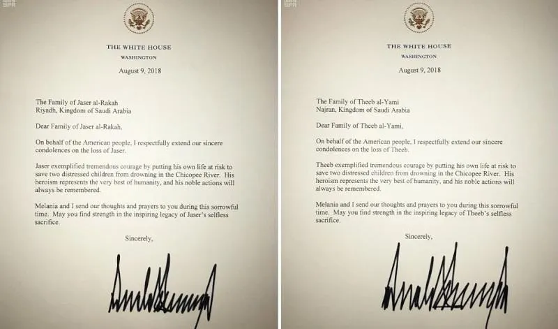 بعث الرئيس الأميركي دونالد ترمب برقيتيْ عزاء ومواساة إلى عائلتيْ الطالبين السعوديين ذيب بن مانع اليامي وجاسر بن دهام اليامي اللذين استشهدا غرقاً في ولاية ماساتشوستس أثناء محاولتهما إنقاذ طفلين أميركيين من الغرق.