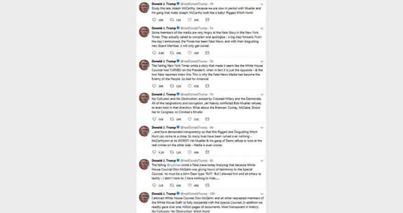 ووصف ترمب التقرير بأنه «مادة مضللة»، وكتب «صحيفة (نيويورك تايمز) الفاشلة كتبت تقريراً يوحي بأن محامي البيت الأبيض انقلب على الرئيس، في حين أن الحقيقة هي عكس ذلك، ومُعدّا التقرير المضللان يعلمان ذلك. لهذا السبب أصبحت وسائل الإعلام المضللة عدو الشعب. هذا سيئ جداً لأميركا!». وطالب الرئيس الأميركي بـ«دراسة الراحل جوزيف مكارثي؛ لأننا الآن في مرحلة يجعل فيها مولر وعصابته جوزيف مكارثي يبدو كأنه طفل. حملة اضطهاد ملفّقة».