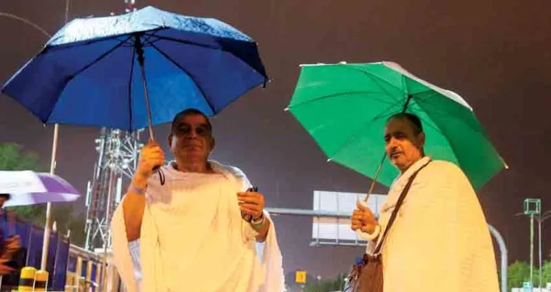 حاجان يحتميان من المطر بمظلتيهما (تصوير: عبد الله الفالح)