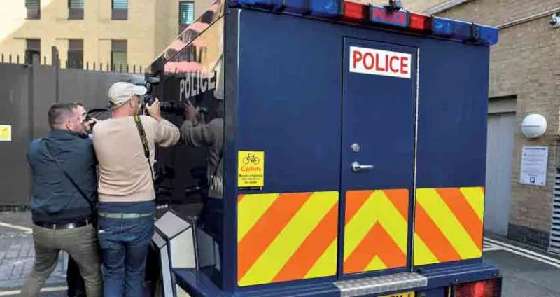 مصورو الصحافة يتعقبون سيارة شرطة اسكوتلنديارد التي أقلت السوداني صالح خاطر منفذ حادث الدهس لدى حضوره إلى محكمة ويستمنستر الجزئية التي إحالته إلى «أولد بيلي» أمس «أ.ف.ب»