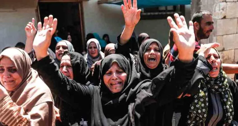 نساء من أقارب كريم أبو فطائر الذي قتلته قوات الاحتلال خلال احتجاجات قرب الحدود خلال جنازته (أ.ف.ب)