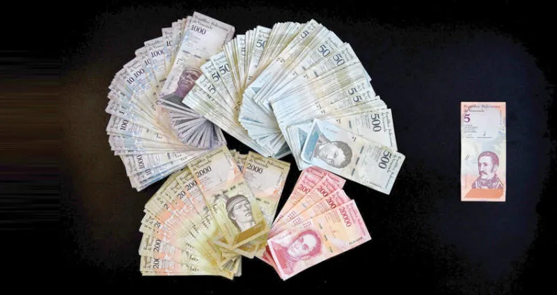 ورقة نقدية فنزويلية من فئة 5 بوليفارات الجديدة وما يوازيها من العملات القديمة (أ.ف.ب)