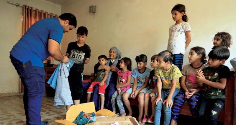 عراقية فقدت خمسة أبناء على يد {داعش} مع أحفادها تتلقى مساعدات في الموصل (رويترز)