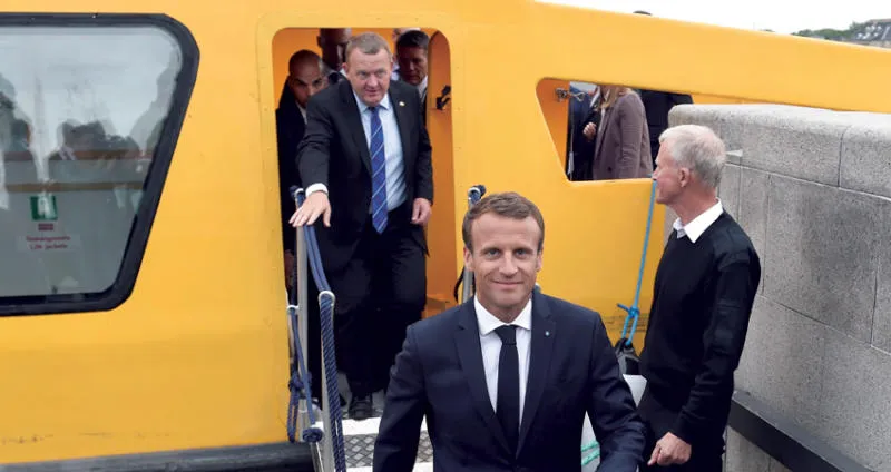 ماكرون ورئيس الوزراء الدنماركي عقب جولة على متن مركب في كوبنهاغن أمس (أ.ب)