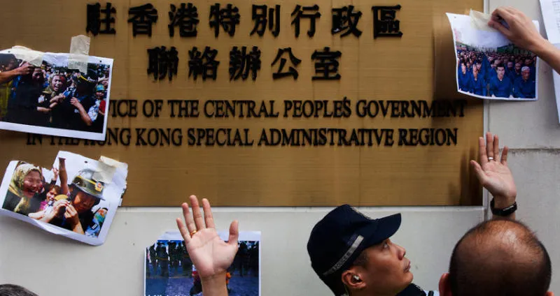 صور رفعها متضامنون مع أقلية الإيغور امام مكتب التنسيق الصيني في هونغ كونغ (إ.ب.أ)