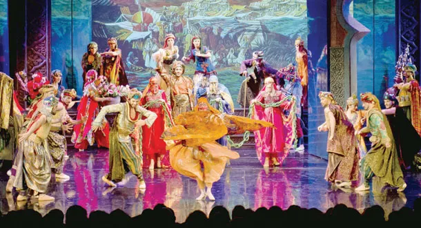 في البدء نشاهد الملك شاهنشاه، الجالس على منصته وحوله حاشيته، والراقصين يتناوبون ويؤدون أمامه ما يسر العين ويدهش الناظر. عبد الحليم كركلا، مبدع كبير في رسم الأزياء واختيار الأقمشة، وجعلها خلابة وزاهية الألوان على المسرح. هذا الجزء الذي تشوبه إطالة نسبية، ويتخلله تتويج الأميرين الشقيقين معا (ولدي شاهنشاه)، ودخولهما في صراع دموي كاسر، بدت أحداثه متداخلة ومربكة، مع طغيان لجماليات مشهدية متتالية، على أنغام موسيقى ألف ليلة وليلة التي تحولت إلى لازمة ترافق الراقصين.