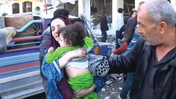 سورية تحاول الهرب بطفلها أمس بعد تعرض منزلها في أحد أحياءحلب لقصف جوي عنيف باستخدام البراميل المتفجرة (أ.ب)